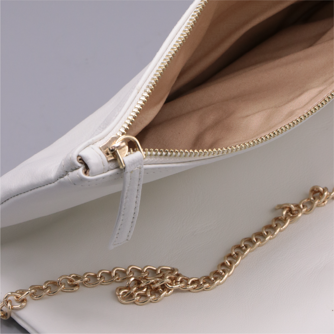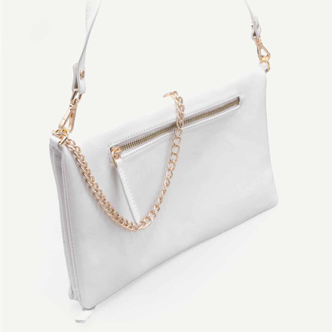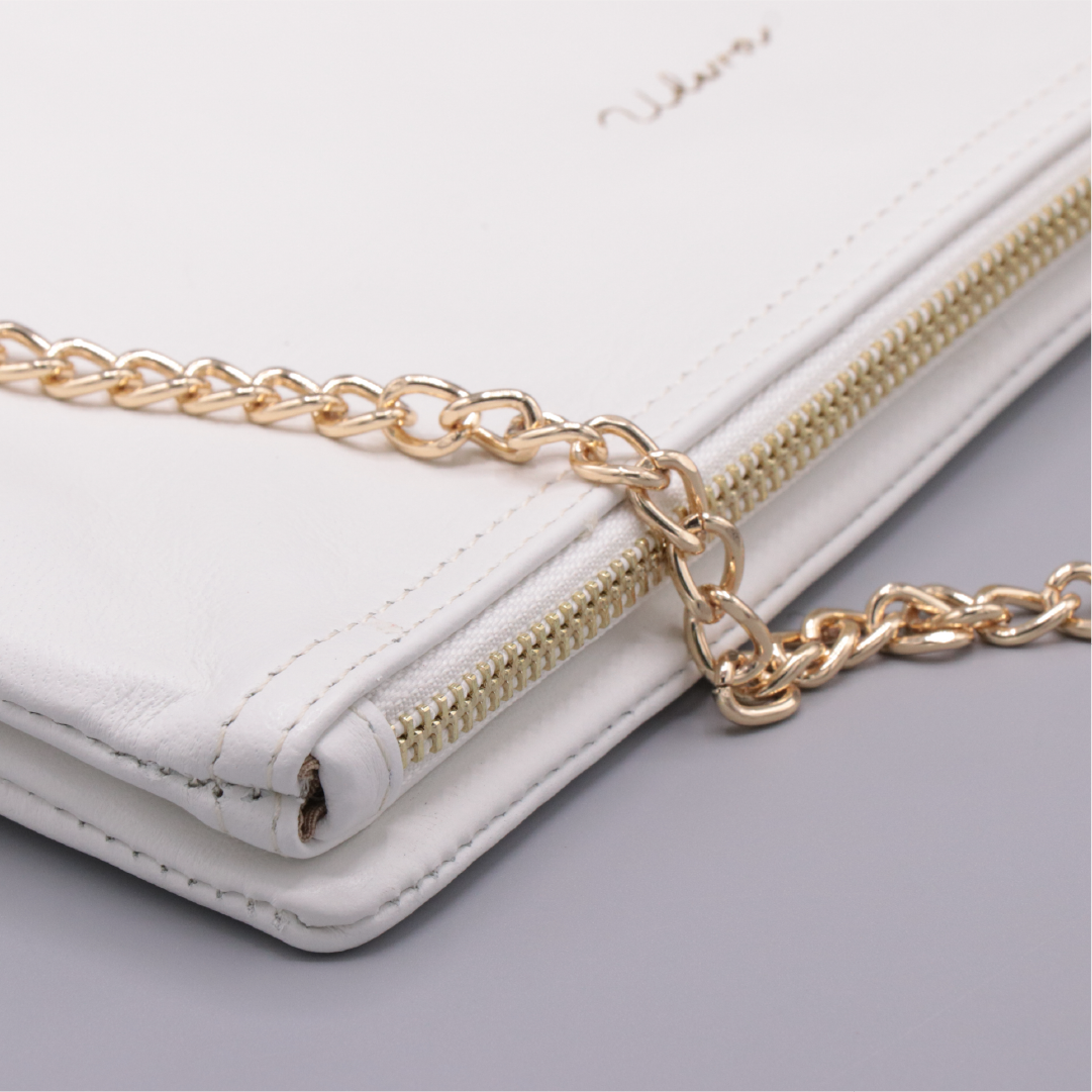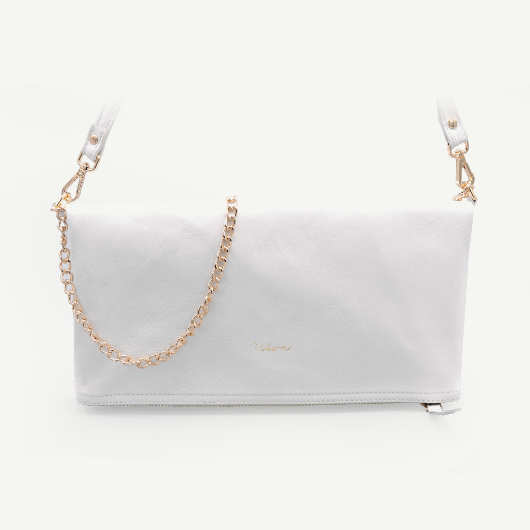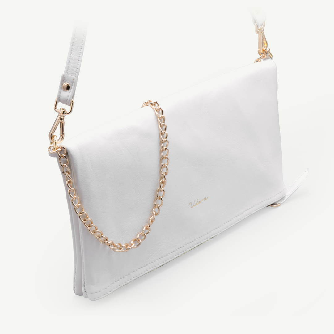 📏 Teknik Detaylar • Materyal: %100 Hakiki Deri • Astar: Kaliteli pamuk astar • Ölçüler: 30x 6 cm • Renk:Beyaz • Kapanış: Fermuarlı ana bölüm + kapak • Askı: Ayarlanabilir ve çıkarılabilir deri askı • Ek Detay: Altın renk metal zincir aksesuar • Kullanım: Omuz, çapraz ve elde taşımaya uygun • Üretim: El işçiliği